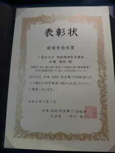 2026年2月28日〜3月1日に嘉ノ雅茗渓館(東京都文京区)で開催された日本ADHD学会第17回総会にて、当講座の加藤隆郎先生が「最優秀発表賞」を受賞されました。受賞演題は「成人期ADHD患者の不眠症を伴う睡眠障害に対する動画を用いたCBT-iの有効性について」です。